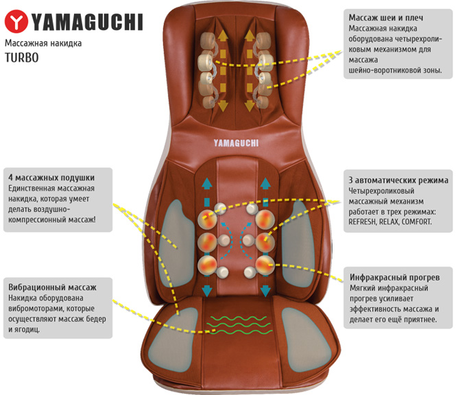 Массажная накидка Yamaguchi Turbo Axiom представляет уникальное устройство для воздушно-компрессорного массажа ягодиц и поясницы. В его конструкцию включены механизмы, позволяющие проводить массаж по трем разным техникам с использованием роликов, вибрации и инфракрасного прогревания. Такой комплекс рабочих функций создает возможности для индивидуального подбора массажного сеанса любой продолжительности на усмотрение пользователя.